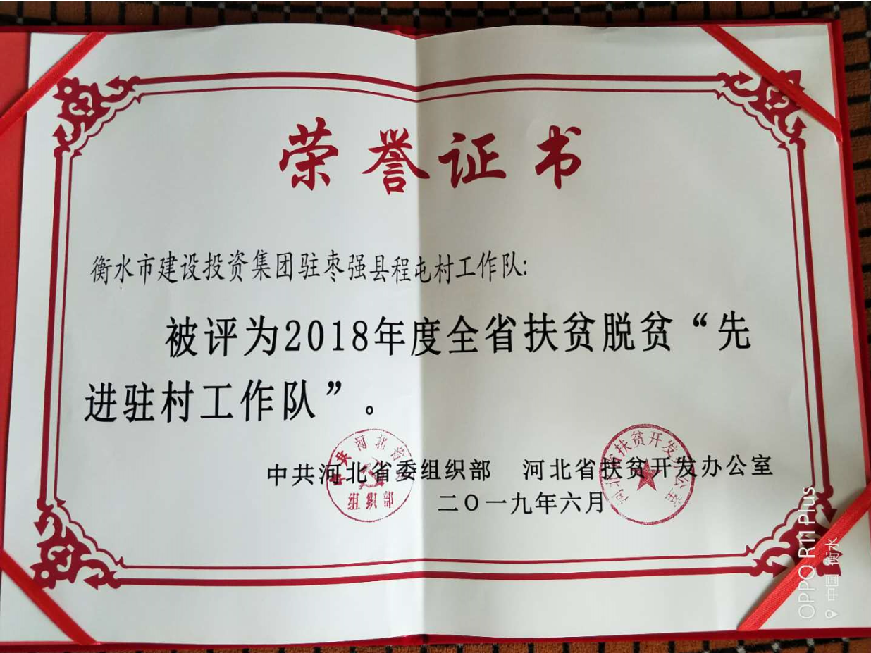 衡水市建設投資集團有限公司駐衡水市棗強縣棗強鎮程屯村駐村工作隊,自2018年3月駐村以來,立足程屯村貧困實際,按照習近平總書記關于精準扶貧、精準脫貧的要求,堅持一切從實際出發、因地制宜,堅持科學謀劃、穩步推進,堅持問題導向、強化責任擔當,扎實有序推進程屯村扶貧各項工作。先后投資70余萬元,完成改造道路、擴建魚塘、安裝路燈、修建籃球場、綠化美化等實事好事,村容村貌明顯改善,村民幸福指數明顯提升,受到市縣鄉領導的充分肯定和廣大村民的一致好評。2018年被河北省扶貧開發和脫貧工作領導小組授予“脫貧攻堅先進集體”稱號,在2019年年度“七一表彰”中,再次被河北省委組織部和河北省扶貧開發辦公室授予2018年度全省扶貧脫貧“先進駐村工作隊”稱號。