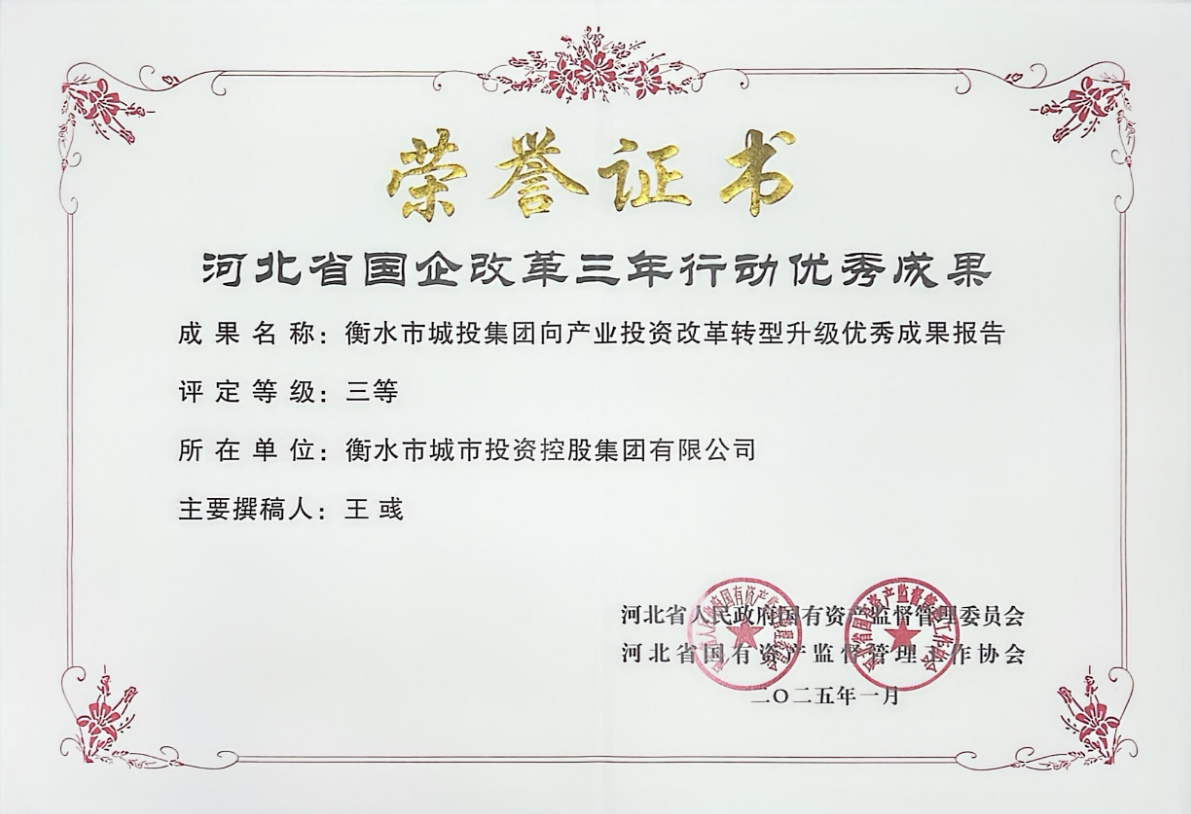 在近期舉辦的河北省國(guó)企改革深化提升成果發(fā)布會(huì)上,城投集團(tuán)提交的《衡水市城投集團(tuán)向產(chǎn)業(yè)投資改革轉(zhuǎn)型升級(jí)優(yōu)秀成果報(bào)告》榮獲河北省省級(jí)三等獎(jiǎng),成為衡水市唯一獲獎(jiǎng)的國(guó)有企業(yè)。